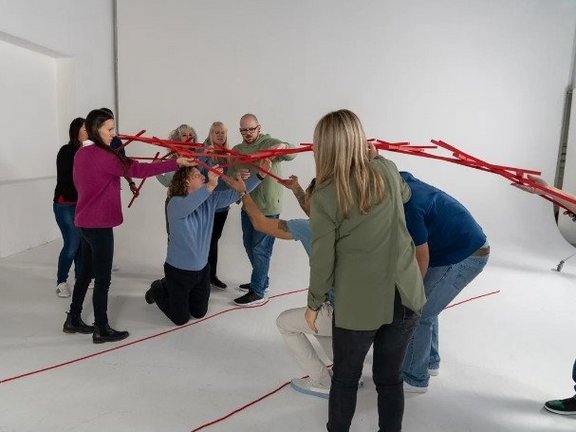 Die Teilnehmer bekommen als Gesamtteam die Aufgabe mit lediglich einigen Holzstäben -ohne weitere Hilsmittel- eine Brücke zu bauen.